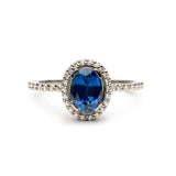 Amazing deep blue oval sapphire, framed in diamonds.